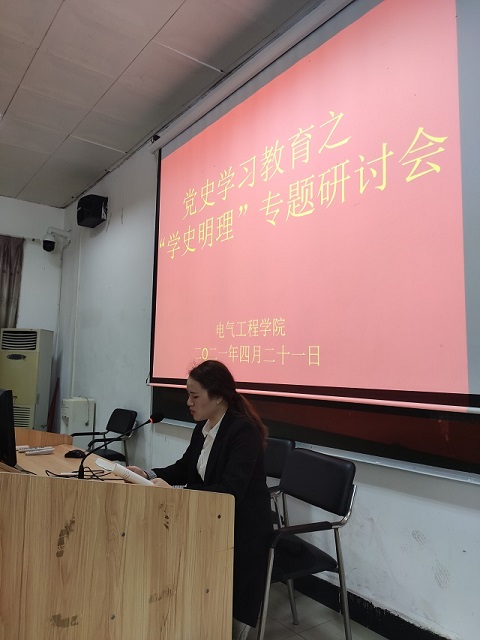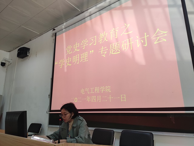 2021年4月21日下午,電氣工程學(xué)院黨總支全體黨員在辦公樓一樓多媒體教室開(kāi)展黨史學(xué)習(xí)教育之“學(xué)史明理”專題研討會(huì)。