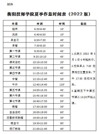 附件:衡陽技師學院夏季作息時間表(2022版)