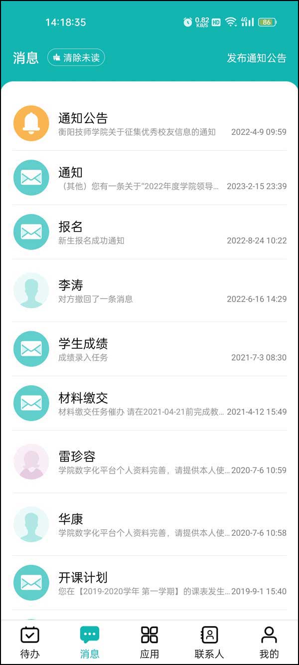 2. “消息”欄中可以接收學(xué)校發(fā)送的各種通知公告及交辦任務(wù),如下圖所示。