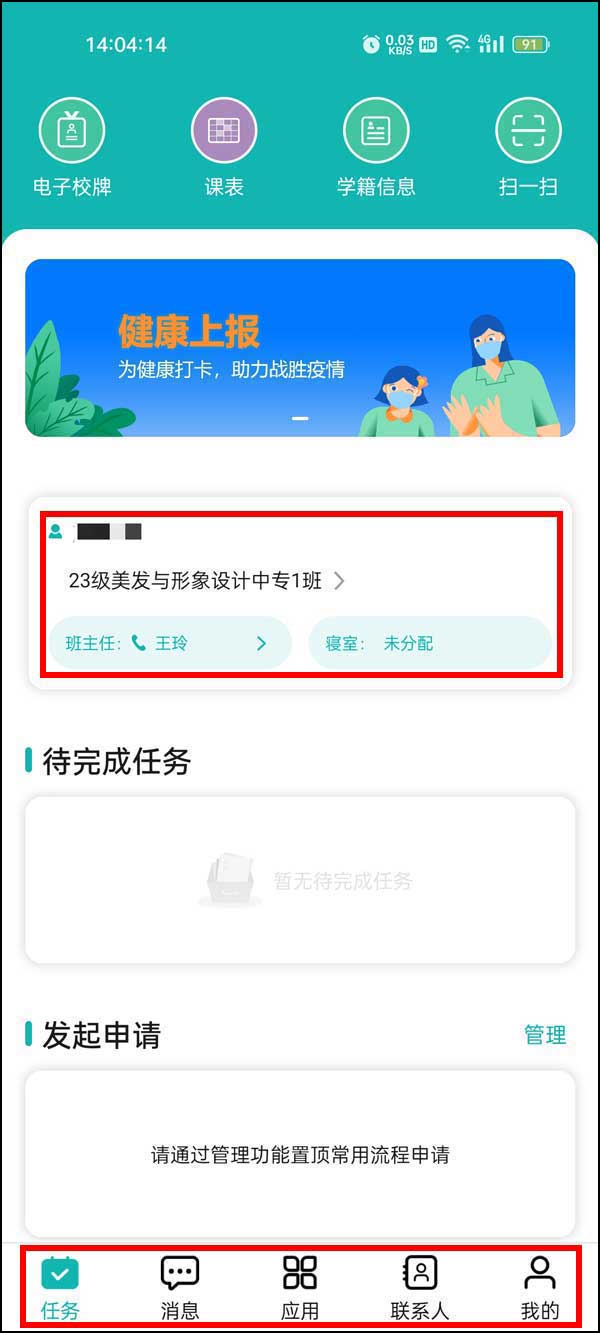 1. 登錄成功后,中間位置顯示姓名、所在班級、班主任姓名及聯(lián)系方式,寢室到校安排,點(diǎn)擊班級名稱可顯示出“班級信息”和“我的同學(xué)”等信息。最下部的導(dǎo)航欄可以切換顯示不同的服務(wù),如下圖所示。
