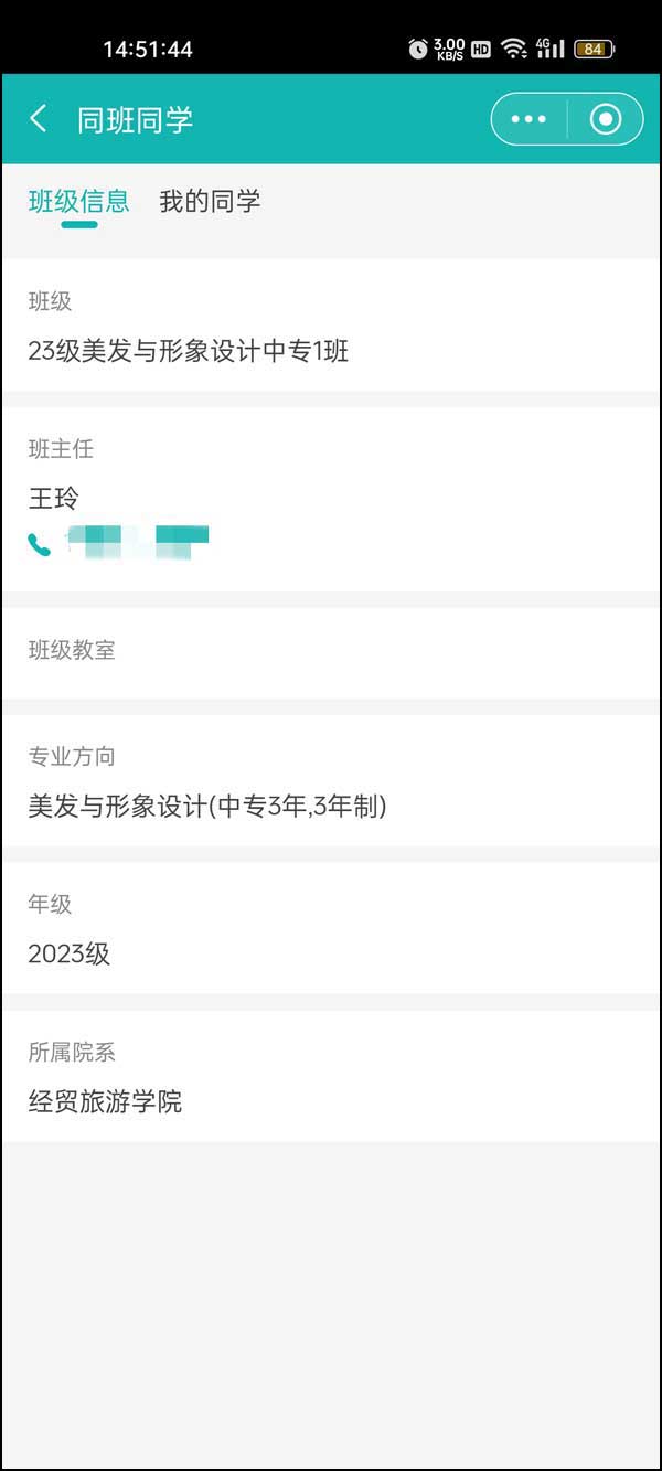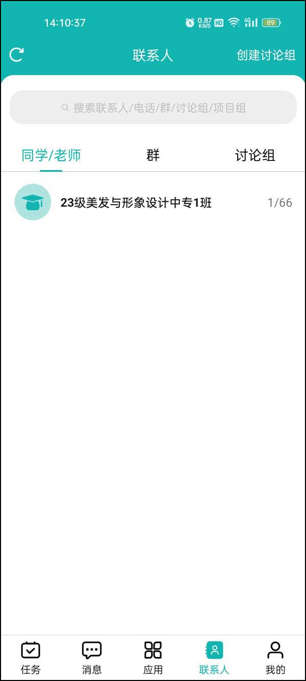 4. “聯(lián)系人”欄目中可以查看到班級同學(xué)及各課程任課老師,并跟他們進(jìn)行互動交流,如下圖所示。