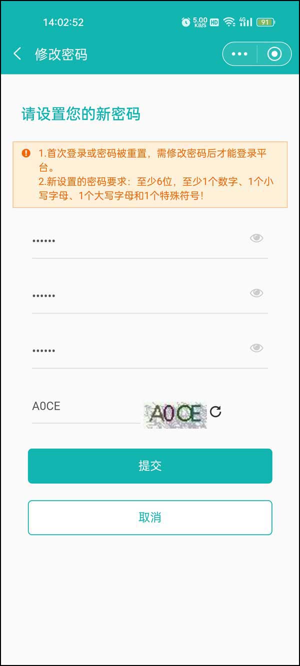 3. 第一次使用身份證號作為登錄賬號,密碼為身份證號后六位(最后一位為X需大寫)再加上BQ4@@g,登錄后需設(shè)置新密碼再次登錄方可使用,如下圖所示。