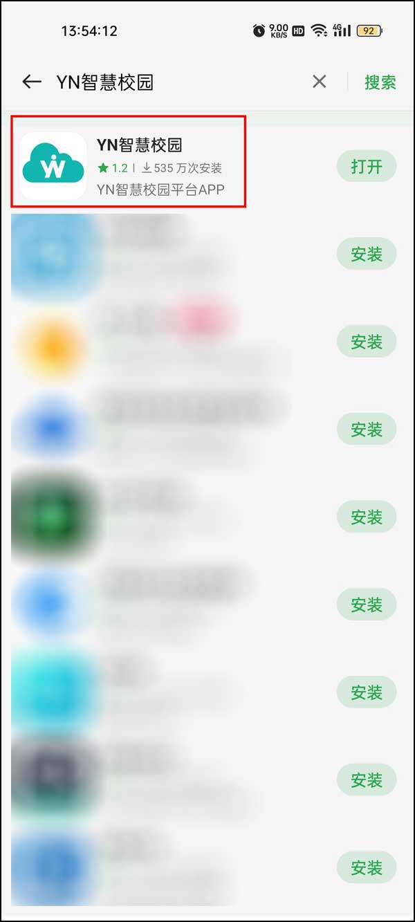 1. 在手機(jī)上打開應(yīng)用市場(安卓手機(jī)在應(yīng)用市場,蘋果手機(jī)在app store),搜索“YN智慧校園”,進(jìn)行安裝并打開,如下圖所示。