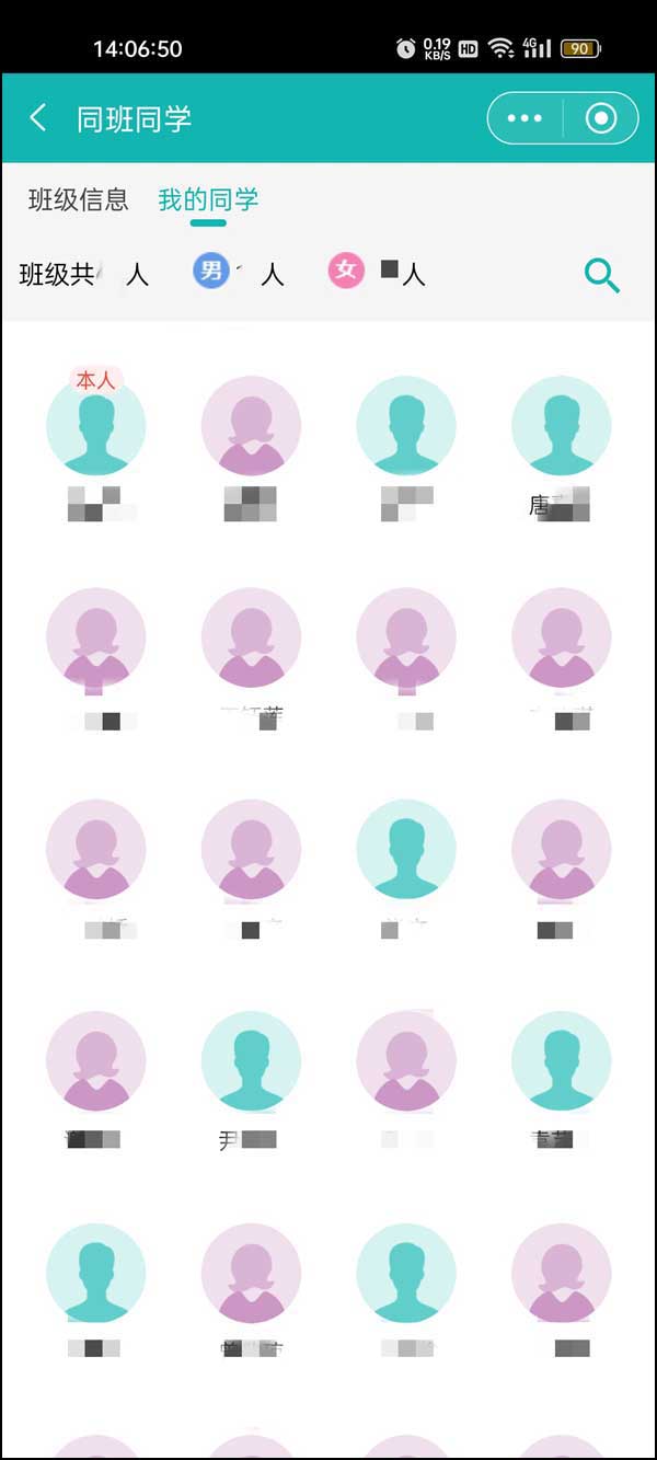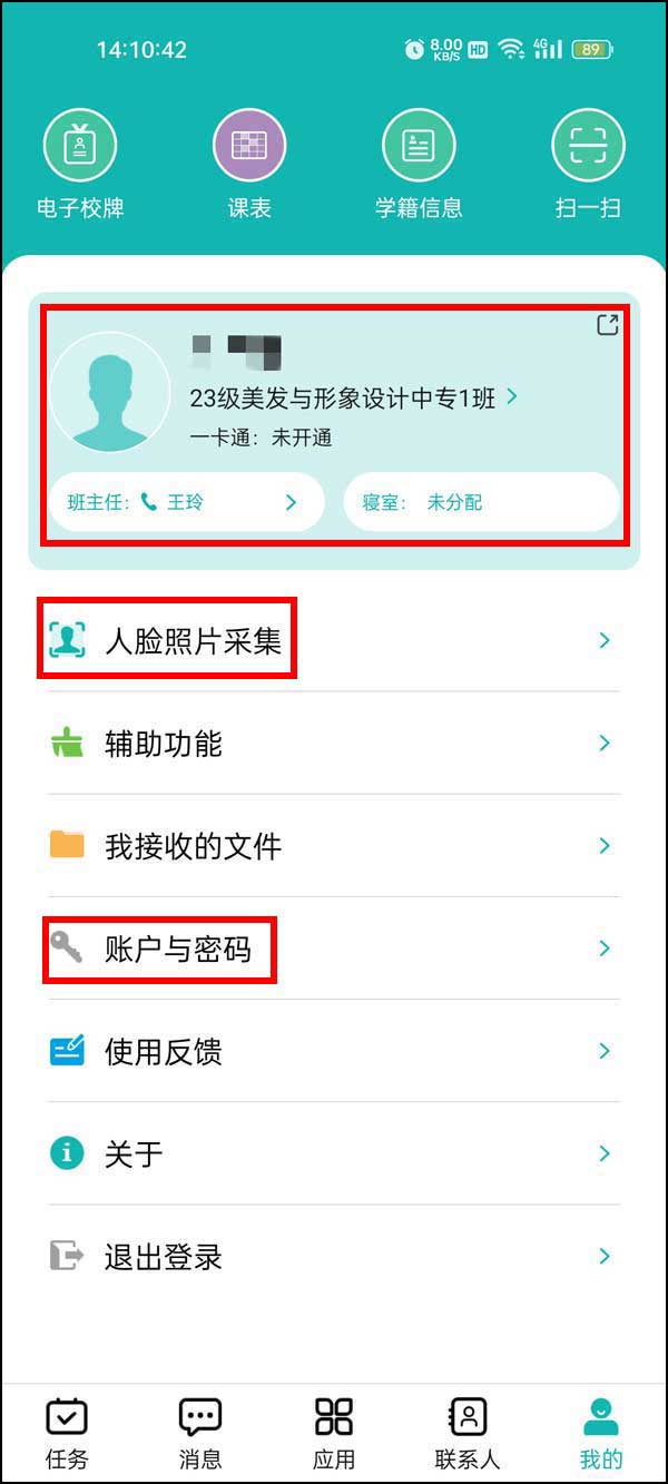 5. “我的”欄目中可以點(diǎn)擊班級名稱可顯示出“班級信息”和“我的同學(xué)”等信息,進(jìn)入“人臉照片采集”進(jìn)行正面免冠照片拍攝并上傳,進(jìn)入“賬戶與密碼”管理本人的登錄賬戶與密碼修改(如忘記密碼請聯(lián)系班主任重置密碼),如下圖所示。