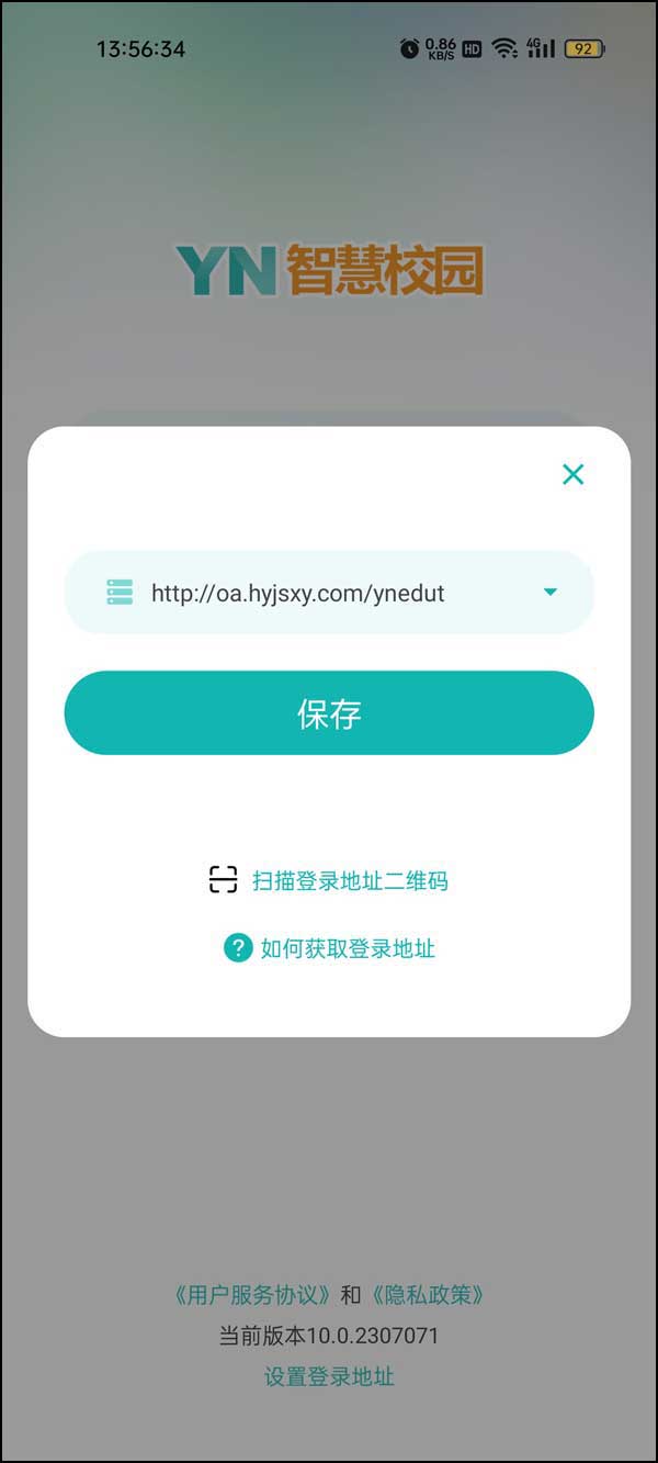 2. 第一次使用需填寫“YN智慧校園”登錄地址,請?zhí)钊?/span>http://oa.www.hehj888.com/ynedut,或通過掃碼自動填入,如下圖所示。