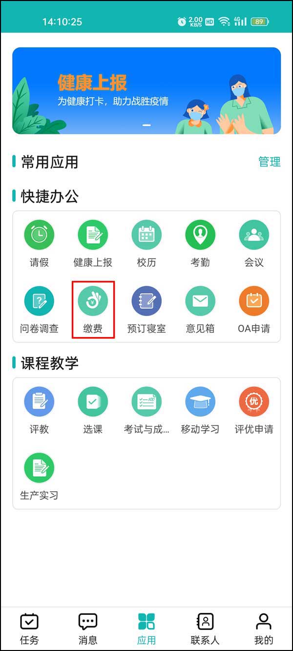 3. “應(yīng)用”欄目中可以進(jìn)行在線辦理各項業(yè)務(wù),例如在“繳費(fèi)”選項里可以查詢費(fèi)用繳納情況,如下圖所示。