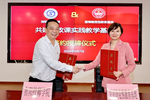 5月7日上午,衡陽技師學(xué)院與夏明翰黨性教育基地舉行了思政課實踐教學(xué)基地簽約儀式。學(xué)院黨委書記肖春林,黨委副書記、院長廖與飛,衡陽縣委常委、組織部部長、統(tǒng)戰(zhàn)部部長羅斌等領(lǐng)導(dǎo)出席,衡陽縣委組織部副部長陳志峰主持儀式。