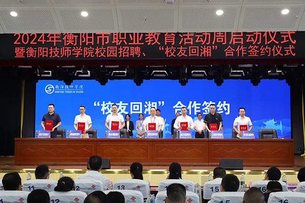 啟動(dòng)儀式后,衡陽技師學(xué)院與中國國際經(jīng)濟(jì)技術(shù)合作促進(jìn)會(huì)、航空航天科技工作委員會(huì)、中國商飛集團(tuán)凱飛航空制造有限責(zé)任公司等11家企業(yè)進(jìn)行校企合作簽約,與岳陽市高級(jí)技工學(xué)校、龍山縣技工學(xué)校、耒陽市中等職業(yè)技術(shù)學(xué)校等7所學(xué)校進(jìn)行校校合作簽約,與湖南力方軋輥有限公司董事長彭龍生、深圳市本色不銹鋼飾品有限公司董事長謝小軍、江門市宏運(yùn)電子科技有限公司董事長蔣健生等6位優(yōu)秀校友代表進(jìn)行“校友回湘”合作簽約。