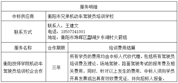衡陽技師學(xué)院機動車駕駛員培訓(xùn)校企合作項目于2024年5月22日結(jié)束,現(xiàn)將中標結(jié)果公告如下: