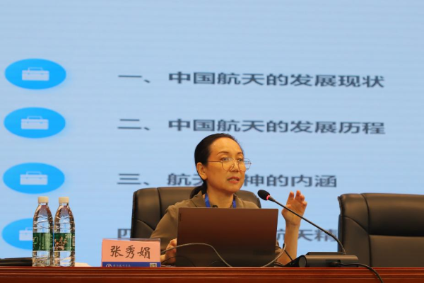 張秀娟教授以《中國航天發(fā)展和航天精神》為題,從中國航天的發(fā)展現(xiàn)狀、發(fā)展歷程以及航天精神的內(nèi)涵分別進(jìn)行了認(rèn)真講解,給大家?guī)砹艘粓鲐S富的航天知識和航天精神盛宴。