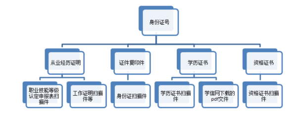 (3)將職業(yè)技能等級認定申報表掃描件、工作證明掃描件及社保證明(圖片大小小于5MB)存放在子文件夾“從業(yè)經(jīng)歷證明”下;學歷證書掃描件、學信網(wǎng)下載的pdf文件放在子文件夾“學歷證書”下;等級證書或資格證書掃描件放在子文件夾“資格證書”下,身份證掃描件存放在子文件夾“證件復印件“下,掃描件都是指以jpg格式保存的。
