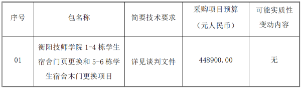 衡陽(yáng)技師學(xué)院的1-4棟學(xué)生宿舍門(mén)頁(yè)更換和5-6棟學(xué)生宿舍木門(mén)更換項(xiàng)目 進(jìn)行競(jìng)爭(zhēng)性談判采購(gòu),現(xiàn)采用發(fā)布公告方式,邀請(qǐng)符合資格條件的供應(yīng)商提交證明材料參與資格審查活動(dòng)。