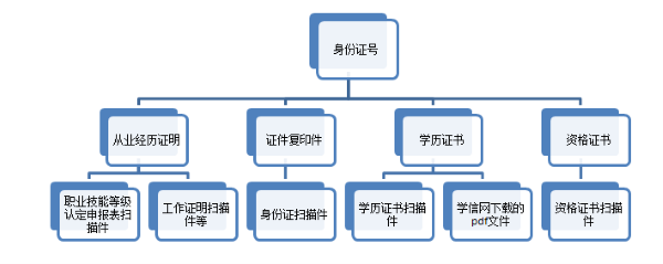 3.將職業(yè)技能等級(jí)認(rèn)定申報(bào)表掃描件、工作證明掃描件(圖片大小小于5MB)存放在子文件夾“從業(yè)經(jīng)歷證明”下;學(xué)歷證書(shū)掃描件、學(xué)信網(wǎng)下載的pdf文件放在子文件夾“學(xué)歷證書(shū)”下;資格證書(shū)掃描件放在子文件夾“資格證書(shū)”下,身份證掃描件存放在子文件夾“證件復(fù)印件“下,掃描件都是指以jpg格式保存的。