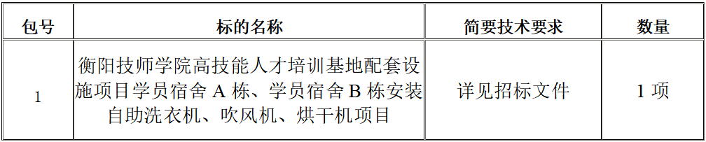 采購(gòu)項(xiàng)目名稱(chēng):衡陽(yáng)技師學(xué)院高技能人才培訓(xùn)基地配套設(shè)施項(xiàng)目學(xué)員宿舍A棟、學(xué)員宿舍B棟安裝自助洗衣機(jī)、吹風(fēng)機(jī)、烘干機(jī)項(xiàng)目
