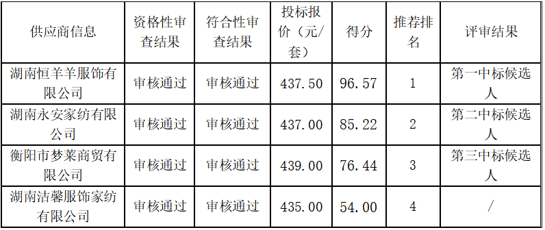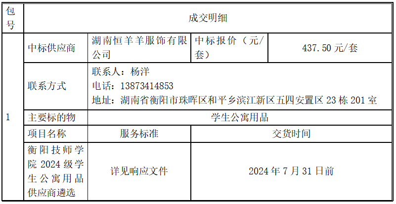 衡陽(yáng)技師學(xué)院2024級(jí)學(xué)生公寓用品供應(yīng)商遴選項(xiàng)目于2024年7月3日評(píng)標(biāo)結(jié)束,現(xiàn)將中標(biāo)(成交)結(jié)果公告如下: