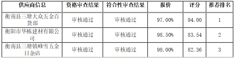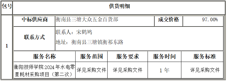 衡陽技師學(xué)院2024年水電零星耗材采購項目(第二次)公開招標采購項目于2024年07月30日結(jié)束,現(xiàn)將中標(成交)結(jié)果公告如下: