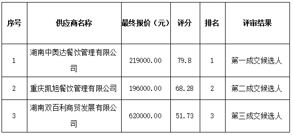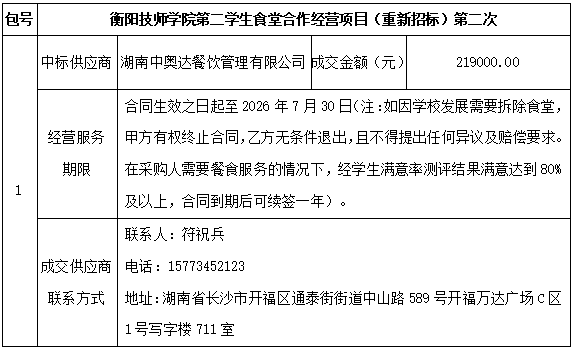 衡陽(yáng)技師學(xué)院的衡陽(yáng)技師學(xué)院第二學(xué)生食堂合作經(jīng)營(yíng)項(xiàng)目(重新招標(biāo))第二次競(jìng)爭(zhēng)性磋商采購(gòu)于2023年9月30日結(jié)束,現(xiàn)將成交結(jié)果公告如下: