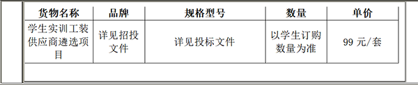 學(xué)生實(shí)訓(xùn)工裝供應(yīng)商遴選項(xiàng)目公開(kāi)招采購(gòu)項(xiàng)目于2024年11月11日結(jié)束,現(xiàn)將中標(biāo)(成交)結(jié)果公告如下: