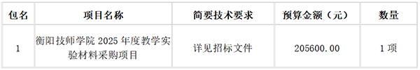 湖南省招標(biāo)有限責(zé)任公司采購代理機構(gòu)受衡陽技師學(xué)院的委托,對衡陽技師學(xué)院2025年度教學(xué)實驗材料采購項目(委托代理編號:0623-2575N3624015)進行公開招標(biāo)采購。歡迎符合資格條件的投標(biāo)人前來投標(biāo)。