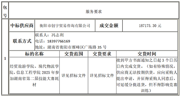 衡陽技師學(xué)院的衡陽技師學(xué)院參加2025年湖南省第二屆技能大賽耗材采購項(xiàng)目公開招標(biāo)采購項(xiàng)目于2025年01月13日結(jié)束,現(xiàn)將中標(biāo)(成交)結(jié)果公告如下: