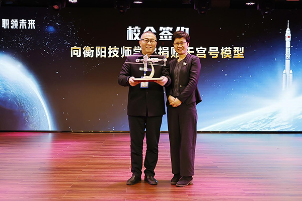 活動(dòng)伊始,全體人員觀看了航天主題宣傳視頻,回顧我國航天事業(yè)的輝煌成就?,F(xiàn)場,學(xué)院與上海銀領(lǐng)智造科技有限公司簽署校企合作協(xié)議,周少良與企業(yè)代表王紅峰共同簽約,王瀾代表學(xué)院接受企業(yè)捐贈(zèng)的“天宮號(hào)”模型。