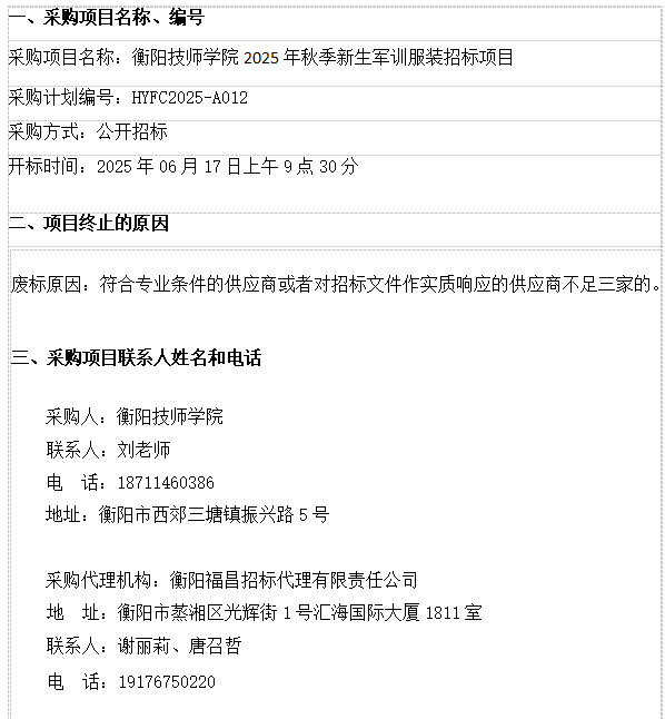 衡陽技師學(xué)院2025年秋季新生軍訓(xùn)服裝招標(biāo)項(xiàng)目 廢標(biāo)公告