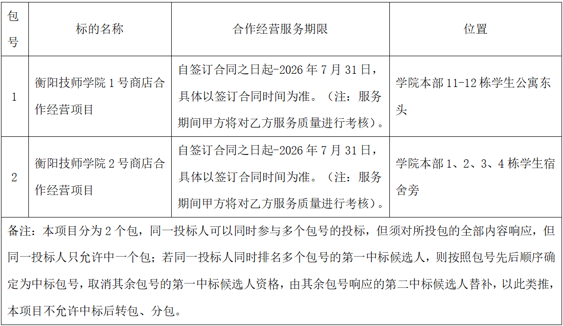 衡陽(yáng)技師學(xué)院1、2號(hào)商店合作經(jīng)營(yíng)項(xiàng)目院內(nèi)自主招標(biāo)于2025年8月7日結(jié)束,現(xiàn)將中標(biāo)結(jié)果公告如下: