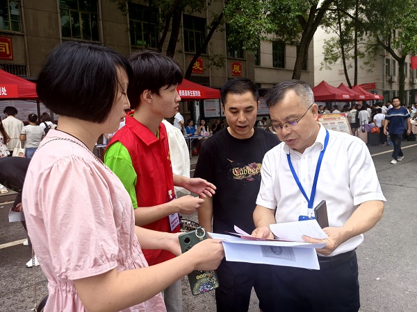 “家長(zhǎng),您好!資料復(fù)印好了,您拿好?!睓C(jī)關(guān)第一黨支部黨員志愿者羅振南正在為新生及家長(zhǎng)免費(fèi)復(fù)印入學(xué)報(bào)到資料。這是學(xué)院黨員教師發(fā)揮先鋒模范作用助力迎新工作的縮影。