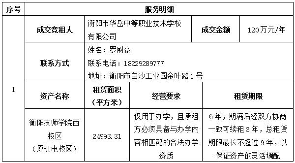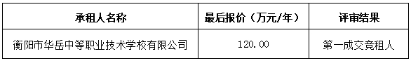 衡陽技師學(xué)院西校區(qū)招租項目競價采購于2025年8月25日結(jié)束,現(xiàn)將成交結(jié)果公告如下:
