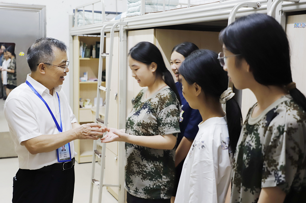 “同學(xué)們,軍訓(xùn)累不累?還適應(yīng)嗎?”“最近休息還好嗎?”“對學(xué)院的宿舍和食堂還滿意嗎?”肖春林一行深入學(xué)生宿舍,向同學(xué)們詢問軍訓(xùn)感受和身體情況,一句句暖心的關(guān)心與問候輕輕撫慰著同學(xué)們的內(nèi)心。