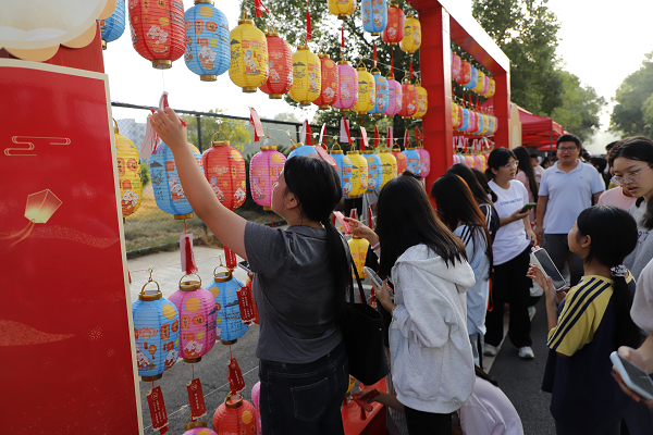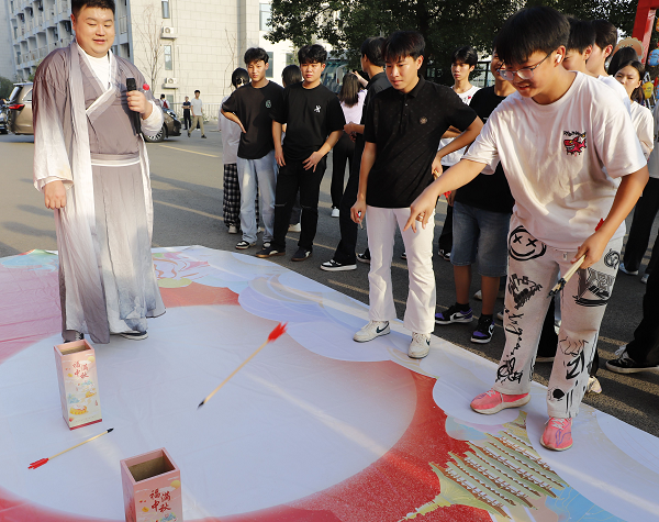 百余條融合民俗知識與詩詞元素的燈謎懸掛于現(xiàn)場,各民族師生在民俗趣猜燈謎區(qū)駐足思索、相互探討,在解謎過程中了解傳統(tǒng)民俗文化。趣味游戲區(qū)人氣爆棚,源自古代禮儀的“投壺”游戲成為現(xiàn)場“爆款”,師生們排隊參與,在瞄準投擲的互動中體驗古代文人雅趣,感受傳統(tǒng)文化的鮮活生命力。