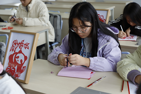 同學(xué)們認真創(chuàng)作民族元素剪紙作品