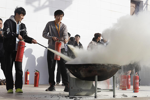消防救援人員指導(dǎo)學(xué)生使用滅火器