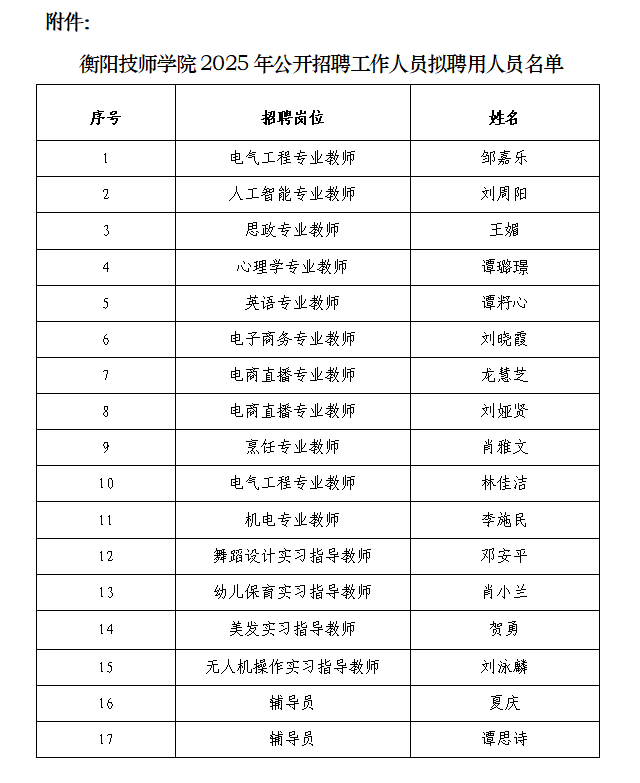 附件:衡陽技師學(xué)院2025年公開招聘工作人員擬聘用人員名單