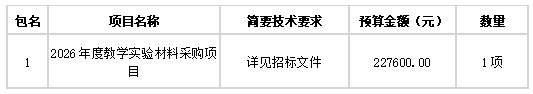 湖南省招標有限責任公司采購代理機構受衡陽技師學院的委托,對2026年度教學實驗材料采購項目(委托代理編號:0623-2685N1124006)進行公開招標采購。歡迎符合資格條件的投標人前來投標。