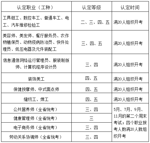 1.初、中、高級(5、4、3級)考試,分為理論知識考核和實操技能考核兩個科目,考核成績均實行百分制,成績達六十分(含)為合格。