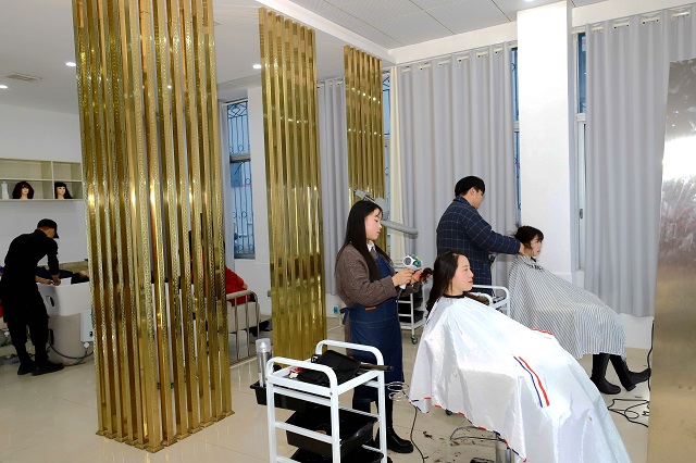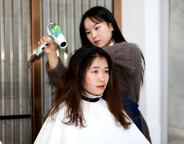 李雯和他的小伙伴們熱情迎接著受邀的每一位老師就座,拿上工具,使出所學(xué),為老師們精心清洗修剪吹燙。三個(gè)小時(shí)的體驗(yàn)時(shí)間,老師們看著鏡子中的自己。“從來(lái)沒(méi)想過(guò)自己在學(xué)校就能親身體驗(yàn)學(xué)生們的服務(wù),感受到孩子們的愛(ài),一切的付出都是值得的?!卑嘀魅卫钣駥?duì)同學(xué)們的手藝非常滿意。
