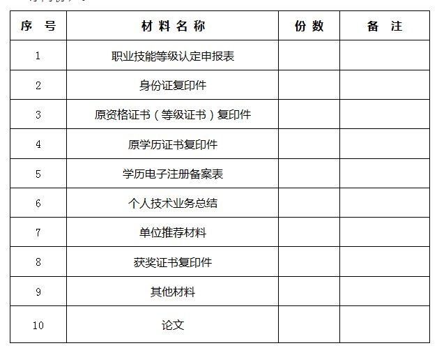 3.申報(bào)國家職業(yè)資格二級(jí)及以上職業(yè)技能鑒定還須提交《個(gè)人技術(shù)總結(jié)》和《單位推薦材料》并加蓋單位公章,以及其他加分材料(市級(jí)以上獎(jiǎng)勵(lì)、市級(jí)以上技能競賽中獲獎(jiǎng)證書、或者承擔(dān)技術(shù)革新和技術(shù)改造,取得重大成果)。