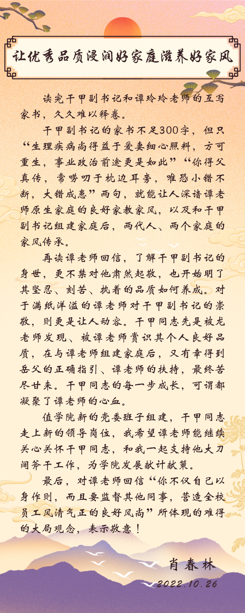 清廉學(xué)校——書記、院長評(píng)家書(一)|黨委書記肖春林同志評(píng)家書:讓優(yōu)秀品質(zhì)浸潤好家庭滋養(yǎng)好家風(fēng)