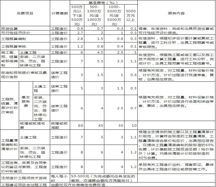 注:1、上表收費(fèi)實(shí)行差額定率累進(jìn)計(jì)費(fèi),低于1000元的按1000元。計(jì)費(fèi)方式舉例如下:某土建工程施工圖預(yù)算編制的工程造價(jià)為5000萬,計(jì)算服務(wù)費(fèi)為:500萬元*6‰+(1000-500)萬元*4.5‰+(5000-1000)萬元*2.5‰=15.25萬元;