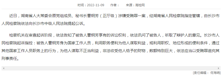 畫外音:2022年11月,曹炯芳被開除黨籍和公職,其涉嫌犯罪問(wèn)題被移送檢察機(jī)關(guān)依法審查起訴。