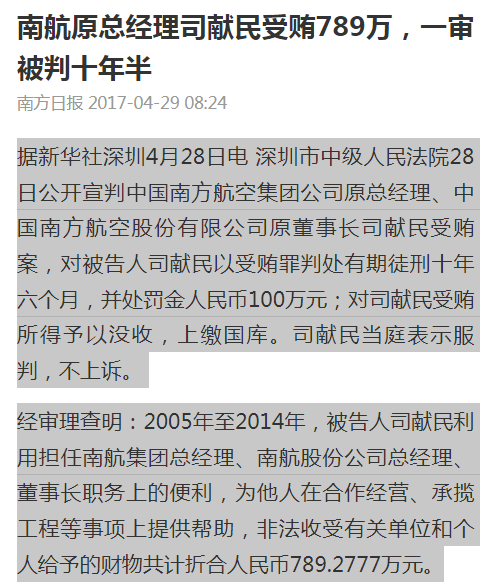 【解說(shuō)詞】2014年11月至12月,中央第一巡視組對(duì)南航集團(tuán)進(jìn)行專(zhuān)項(xiàng)巡視。南航集團(tuán)原黨組副書(shū)記、總經(jīng)理司獻(xiàn)民,因巡視發(fā)現(xiàn)的問(wèn)題線索被立案審查。2017年4月,司獻(xiàn)民因受賄罪被判處有期徒刑十年零六個(gè)月。