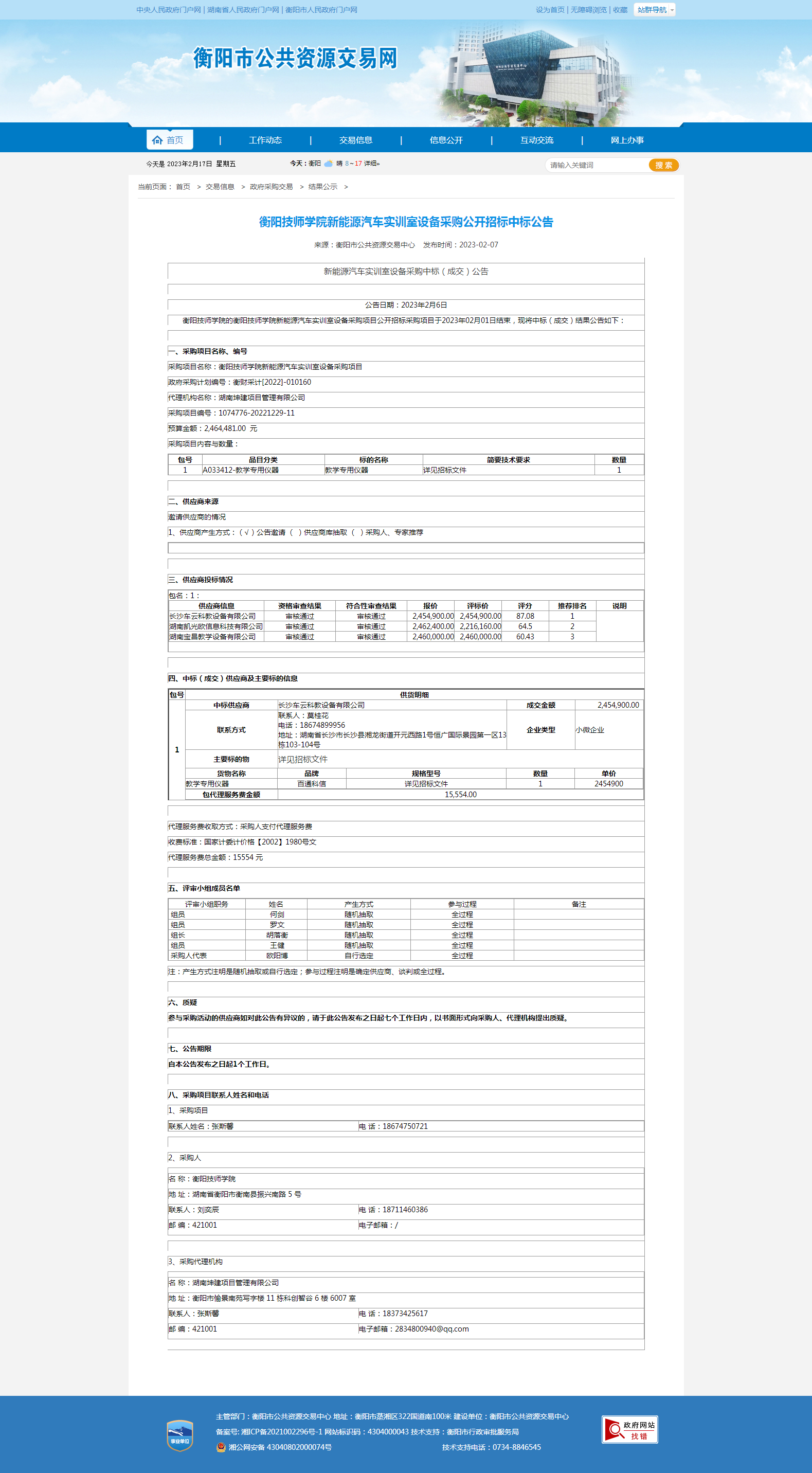 衡陽技師學(xué)院新能源汽車實訓(xùn)室設(shè)備采購公開招標(biāo)中標(biāo)公告