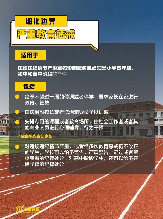 第十條 小學(xué)高年級(jí)、初中和高中階段的學(xué)生違規(guī)違紀(jì)情節(jié)嚴(yán)重或者影響惡劣的,學(xué)校可以實(shí)施以下教育懲戒,并應(yīng)當(dāng)事先告知家長(zhǎng):