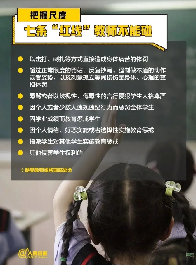 教育懲戒與體罰和變相體罰是不同性質(zhì)的行為。為了防止實(shí)踐中個(gè)別教師將體罰和變相體罰作為教育懲戒實(shí)施,《規(guī)則》專門對(duì)禁止實(shí)施的七類不當(dāng)教育行為作了明確和細(xì)化。一是身體傷害,以擊打、刺扎等方式直接造成身體痛苦的體罰;二是超限度懲罰,超過(guò)正常限度的罰站、反復(fù)抄寫,強(qiáng)制做不適的動(dòng)作或者姿勢(shì),以及刻意孤立等間接傷害身體、心理的變相體罰;三是言行侮辱貶損,辱罵或者以歧視性、侮辱性的言行侵犯學(xué)生人格尊嚴(yán);四是因個(gè)人或者少數(shù)人違規(guī)違紀(jì)行為而懲罰全體學(xué)生;五是因?qū)W生個(gè)人的學(xué)習(xí)成績(jī)而懲罰學(xué)生;六是因個(gè)人情緒、好惡實(shí)施或者選擇性實(shí)施教育懲戒;七是指派學(xué)生代替自己對(duì)其他學(xué)生實(shí)施教育懲戒。通過(guò)劃定這些“紅線”,有利于教師規(guī)范行為、把握尺度,也有利于學(xué)生、家長(zhǎng)和社會(huì)監(jiān)督。