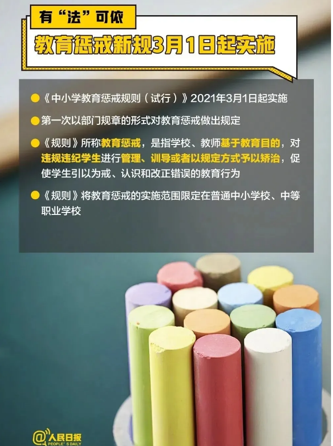 《中小學(xué)教育懲戒規(guī)則(試行)》已經(jīng)2020年9月23日教育部第3次部務(wù)會(huì)議審議通過(guò),現(xiàn)予公布,自2021年3月1日起施行。