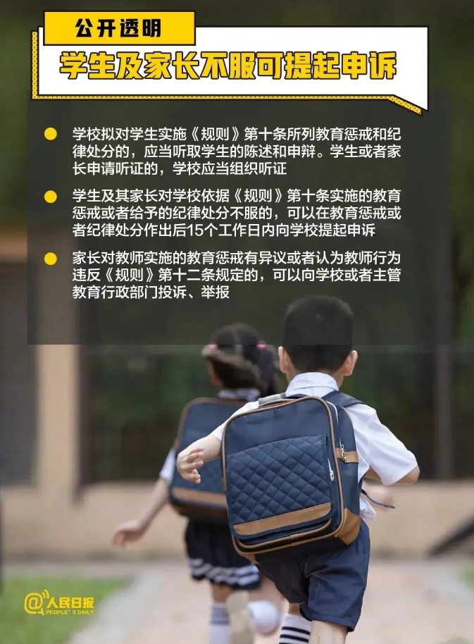 第十七條 學(xué)生及其家長(zhǎng)對(duì)學(xué)校依據(jù)本規(guī)則第十條實(shí)施的教育懲戒或者給予的紀(jì)律處分不服的,可以在教育懲戒或者紀(jì)律處分作出后15個(gè)工作日內(nèi)向?qū)W校提起申訴。