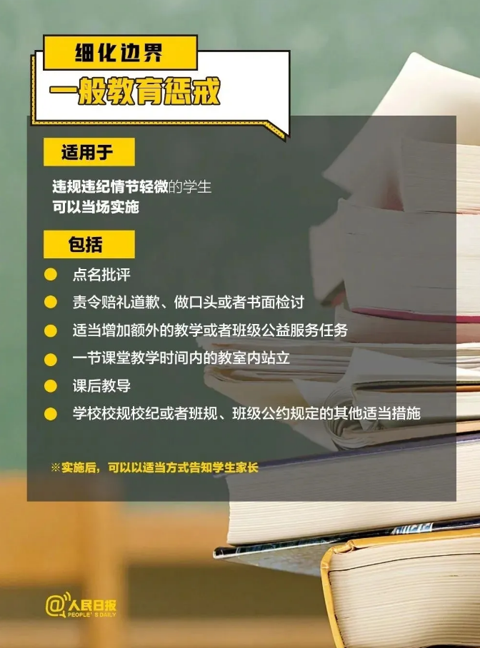 第九條 學(xué)生違反校規(guī)校紀(jì),情節(jié)較重或者經(jīng)當(dāng)場(chǎng)教育懲戒拒不改正的,學(xué)??梢詫?shí)施以下教育懲戒,并應(yīng)當(dāng)及時(shí)告知家長(zhǎng):