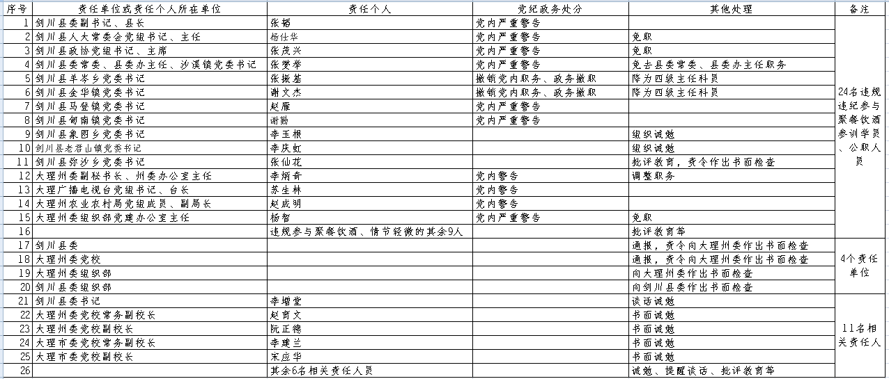 對(duì)24名違規(guī)違紀(jì)參與聚餐飲酒參訓(xùn)學(xué)員、公職人員的處理:給予劍川縣委副書記、縣長張韜黨內(nèi)嚴(yán)重警告處分;給予劍川縣人大常委會(huì)黨組書記、主任楊仕華黨內(nèi)嚴(yán)重警告處分,免職;給予劍川縣政協(xié)黨組書記、主席張茂興黨內(nèi)嚴(yán)重警告處分,免職;給予劍川縣委常委、縣委辦主任、沙溪鎮(zhèn)黨委書記張燮舉黨內(nèi)嚴(yán)重警告處分,免去縣委常委、縣委辦主任職務(wù);給予劍川縣羊岑鄉(xiāng)黨委書記張振基撤銷黨內(nèi)職務(wù)、政務(wù)撤職處分,降為四級(jí)主任科員;給予劍川縣金華鎮(zhèn)黨委書記謝文杰撤銷黨內(nèi)職務(wù)、政務(wù)撤職處分,降為四級(jí)主任科員;給予劍川縣馬登鎮(zhèn)黨委書記趙雁黨內(nèi)嚴(yán)重警告處分;給予劍川縣甸南鎮(zhèn)黨委書記謝勤黨內(nèi)嚴(yán)重警告處分;給予劍川縣象圖鄉(xiāng)黨委書記李玉根組織誡勉;給予劍川縣老君山鎮(zhèn)黨委書記李慶虹組織誡勉;對(duì)劍川縣彌沙鄉(xiāng)黨委書記張仙花批評(píng)教育,責(zé)令作出書面檢查;給予大理州委副秘書長、州委辦公室主任李炳奇黨內(nèi)警告處分,調(diào)整職務(wù);給予大理廣播電視臺(tái)黨組書記、臺(tái)長蘇生林黨內(nèi)警告處分;給予大理州農(nóng)業(yè)農(nóng)村局黨組成員、副局長趙成明黨內(nèi)警告處分;給予大理州委組織部黨建辦公室主任楊智黨內(nèi)嚴(yán)重警告處分,免職;對(duì)違規(guī)參與聚餐飲酒、情節(jié)輕微的其余9人給予批評(píng)教育等處理。