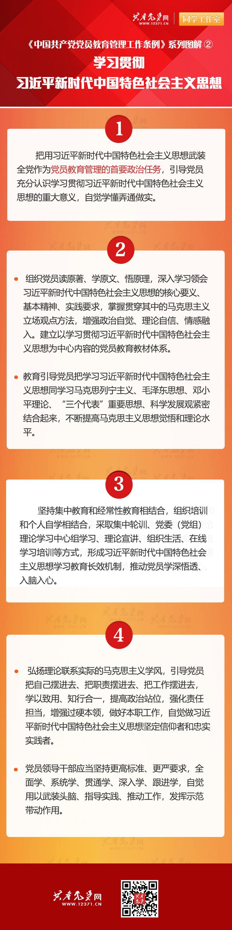 第六條 組織黨員讀原著、學(xué)原文、悟原理,深入學(xué)習(xí)領(lǐng)會(huì)習(xí)近平新時(shí)代中國(guó)特色社會(huì)主義思想的核心要義、基本精神、實(shí)踐要求,掌握貫穿其中的馬克思主義立場(chǎng)觀點(diǎn)方法,增強(qiáng)政治自覺(jué)、理論自信、情感融入。建立以學(xué)習(xí)貫徹習(xí)近平新時(shí)代中國(guó)特色社會(huì)主義思想為中心內(nèi)容的黨員教育教材體系。